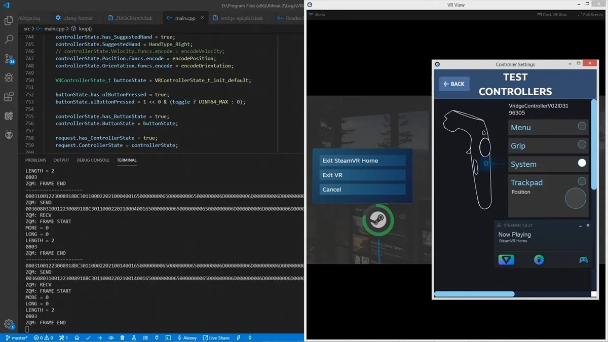 In this project I was tinkering with ESP8266, making it connect to the PC over Wi-Fi. I used it for emulation of an HTC Vive VR controller through VRidge API over ZeroMQ protocol. During the process I also wrote a simplified ZMQ client that can run on Arduino.